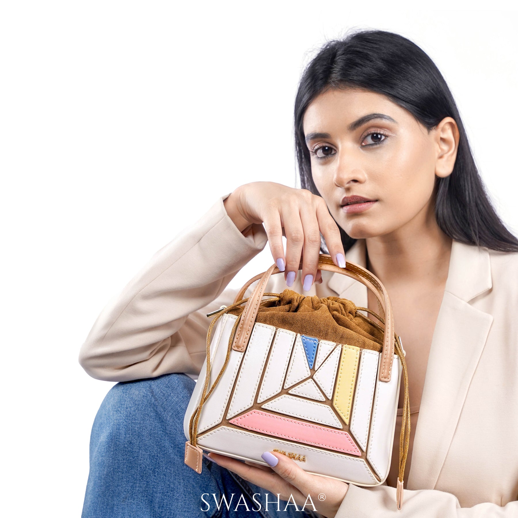 This bag boasts a distinctive design that merges elegance with modern art-inspired geometry. The front showcases an intricate, multi-panel arrangement in soft hues of ivory, blush pink, light blue, and beige, forming a symmetrical pattern that creates a visually appealing effect. The drawstring pouch inside, in a contrasting tan suede material, adds an earthy feel and can be easily pulled to secure belongings. This bag blends form and function, making it an ideal choice for casual outings and gatherings.