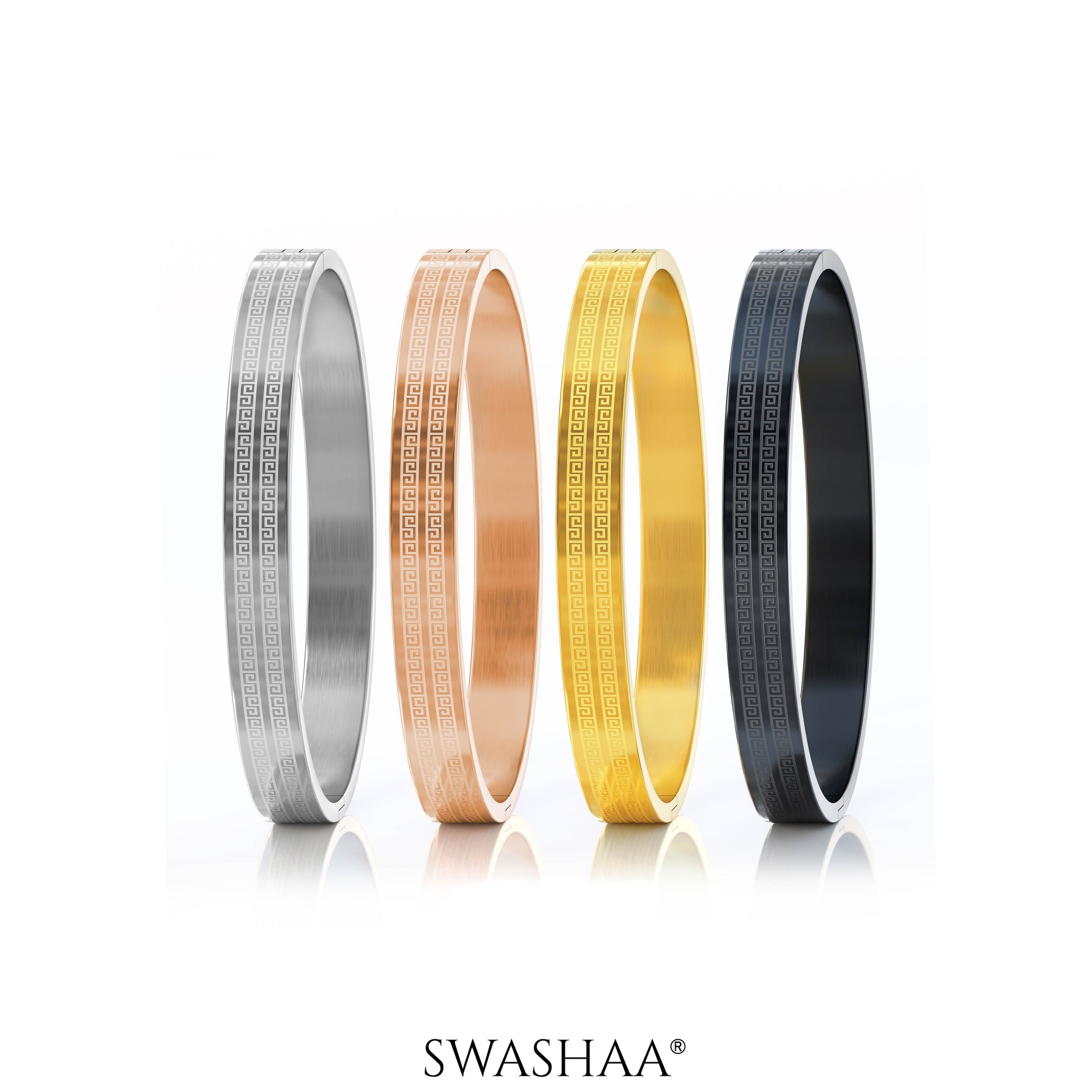 Exuding elegance and sophistication, these kada are available in classic tones of silver, rose gold, gold, and black. Each kada is adorned with intricate Greek key detailing, symbolizing eternity and unity. Crafted with a sleek polished finish, they are perfect for both casual and formal occasions. Timeless and versatile, these kada add a touch of cultural artistry to your jewelry collection.