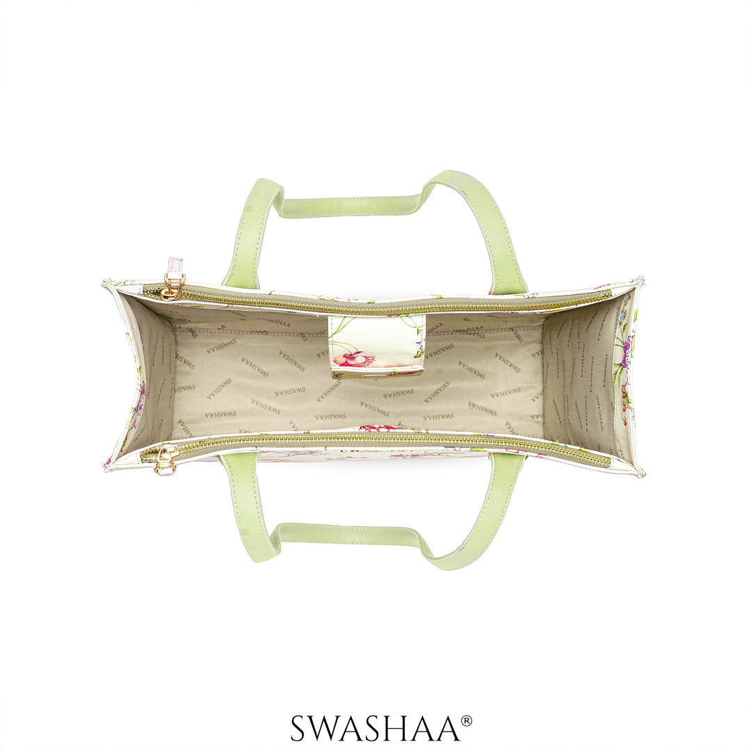 This bag by swashaa beautifully blends elegance and functionality with its premium design. Crafted from high-quality vegan leather, the bag features delicate floral motifs on a durable ivory leather, complemented by pastel green straps for a refreshing, nature-inspired look. The structured silhouette ensures longevity and maintains its shape, making it a reliable everyday companion.