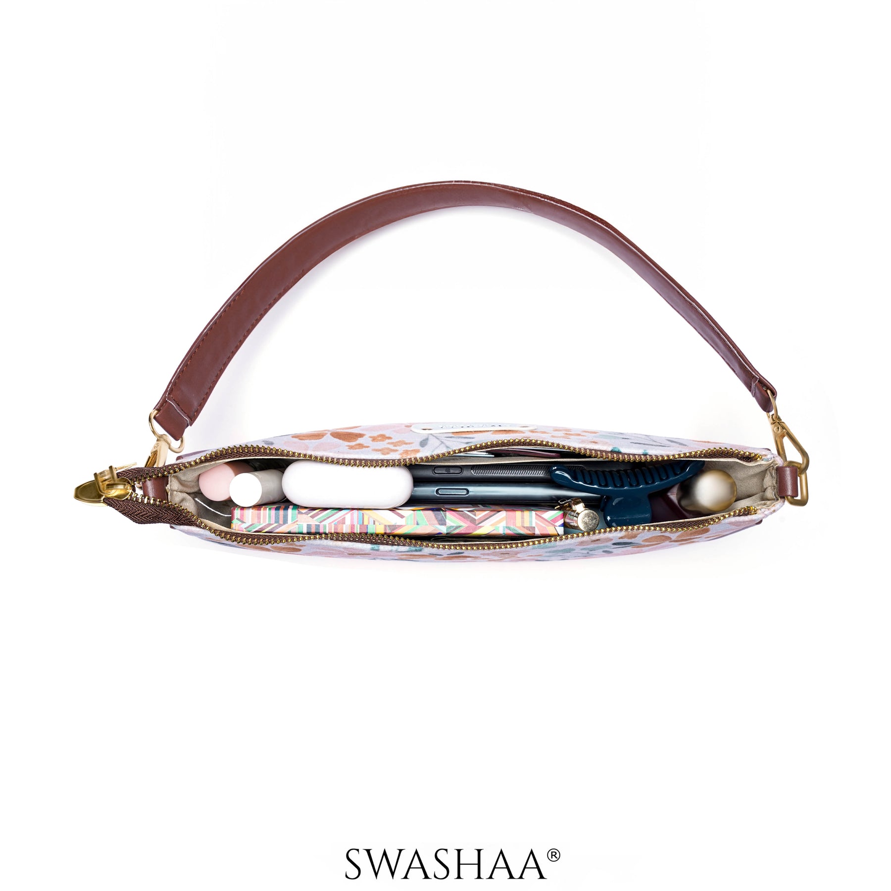 The Aster petal print bag, crafted from Poly Velvet, showcases a delightful floral pattern in peach and blue hues. Its unique boxy half-moon shape, detachable handle, and secure zip closure offer both style and versatility. This elegant accessory combines style and practicality, adding a calming touch to any outfit.