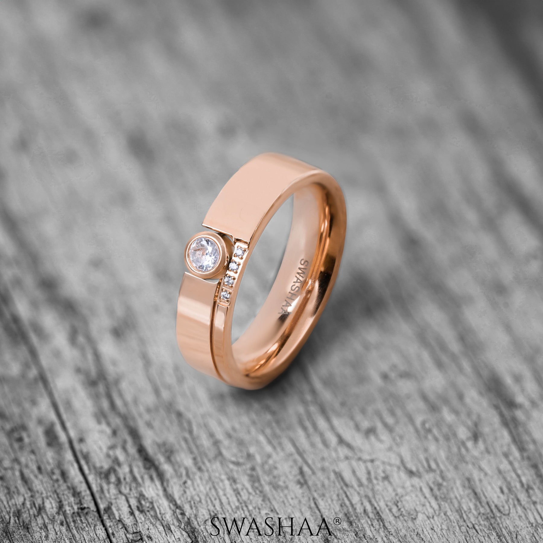 This ring is crafted in a rich rose gold tone, this ring features a unique band that highlights a round-cut central crystal, set within a sleek bezel for a polished finish. Accentuated with smaller crystals along the band, it offers a refined sparkle that catches the eye without overpowering the design. Ideal for those who appreciate understated luxury, this ring is perfect for both formal occasions and adding a touch of elegance to everyday wear.