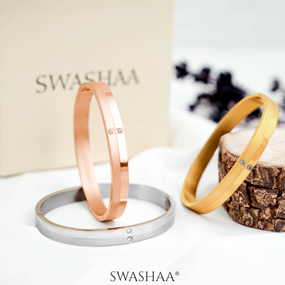 This set of men’s kada bracelets showcases a sleek, polished design with a refined band accented by subtle dual crystal embellishments. Available in luxurious tones of gold, silver, and rose gold, these slip-on bracelets combine modern sophistication with timeless style. Perfect for formal occasions or everyday elegance, they effortlessly complement both tailored suits and casual attire, making them an excellent choice for gifting or personal styling.