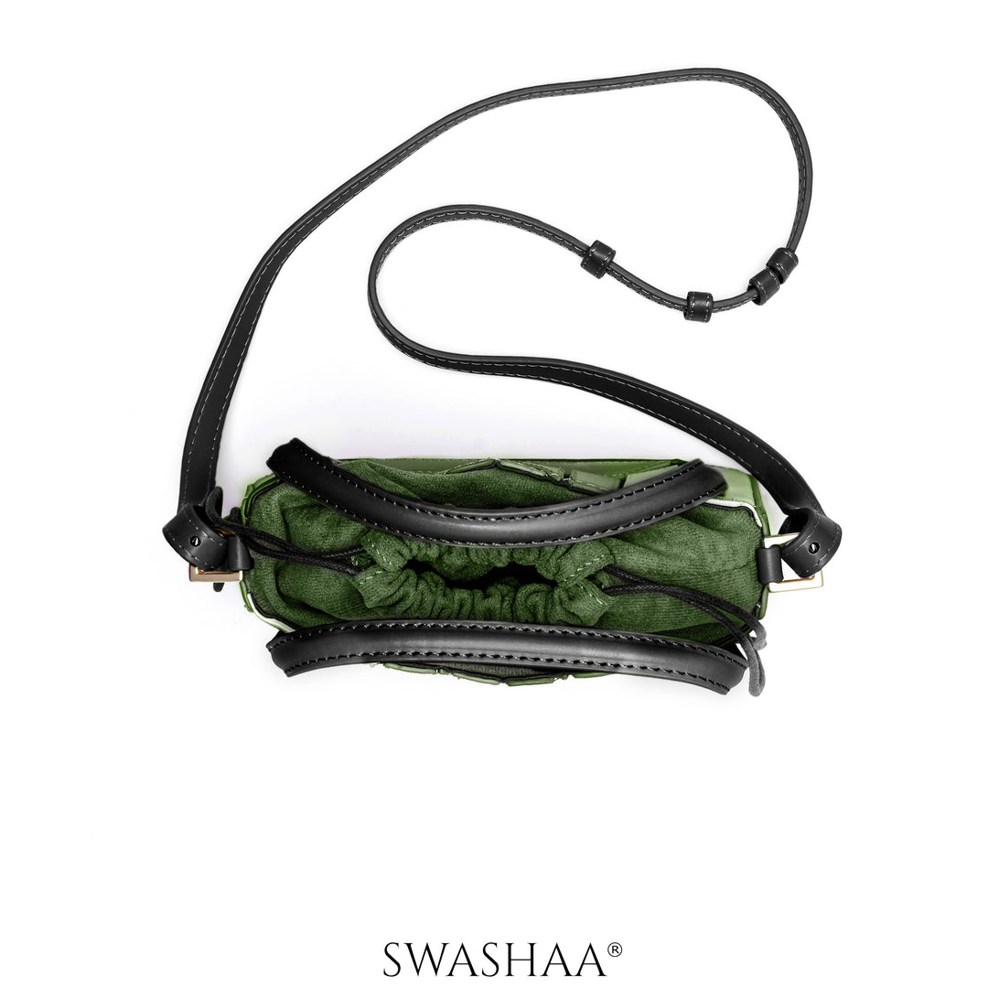 This bag features a unique design with angular, geometric stitched patterns on the front, giving it a modern, edgy look. The olive green body is complemented by black accents, including the handle and drawstring ties, creating a striking color contrast. This bag has a soft, suede drawstring closure that adds a touch of elegance and sophistication. Its structured silhouette is both stylish and functional, offering ample space without compromising on its sleek profile. The included matching strap allows for versatile styling, making it a perfect accessory for day or night outings.