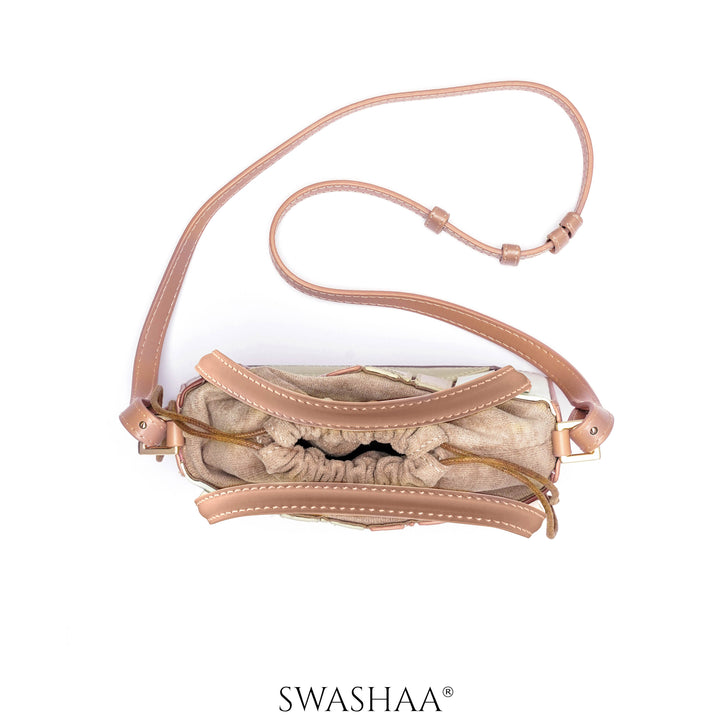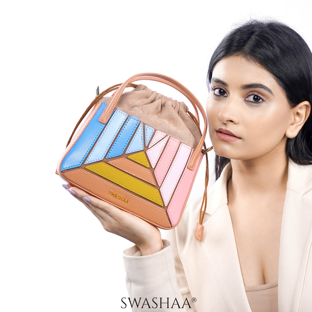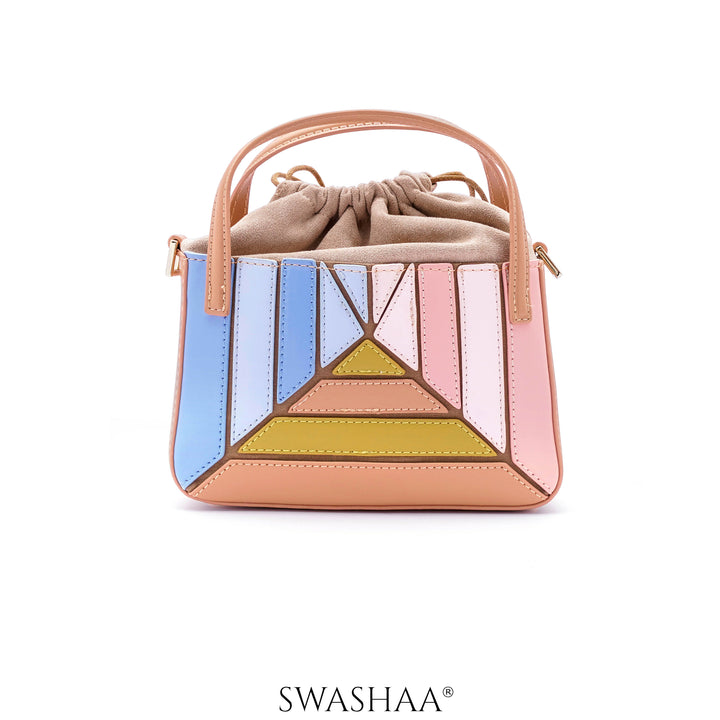 This bag showcases a lively geometric design with soft pastel hues. Its panels feature a charming mix of blue, pink, and yellow shades, intricately stitched for a captivating mosaic effect. The bag is crafted from vegan leather with a structured shape, accented by a drawstring closure for added security. Ideal for casual and semi-formal outings, it effortlessly combines style with functionality. A perfect companion to brighten up your ensemble, this sling bag's compact size and delightful colors make it versatile for any day event or casual gathering.