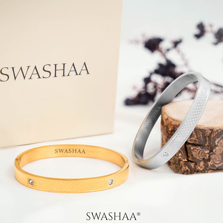 This sleek and sophisticated men’s bracelet features a textured grid pattern adorned with subtle crystal embellishments at each end, adding a refined sparkle. Available in luxurious gold and polished silver tones, its sturdy slip-on design ensures a comfortable and secure fit. Perfect for pairing with formal attire for a polished look or enhancing casual ensembles with a touch of elegance, this bracelet is a versatile addition to any accessory collection.