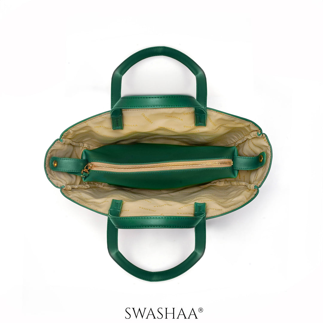 Redefines minimalist elegance with its vivid green tone and sleek silhouette. Crafted from high-quality Vegan leather, the exterior boasts a smooth, polished finish adorned with subtle stitching details and a gold-toned Swashaa logo. Its design combines practicality and style, featuring dual structured handles for effortless shoulder carrying.