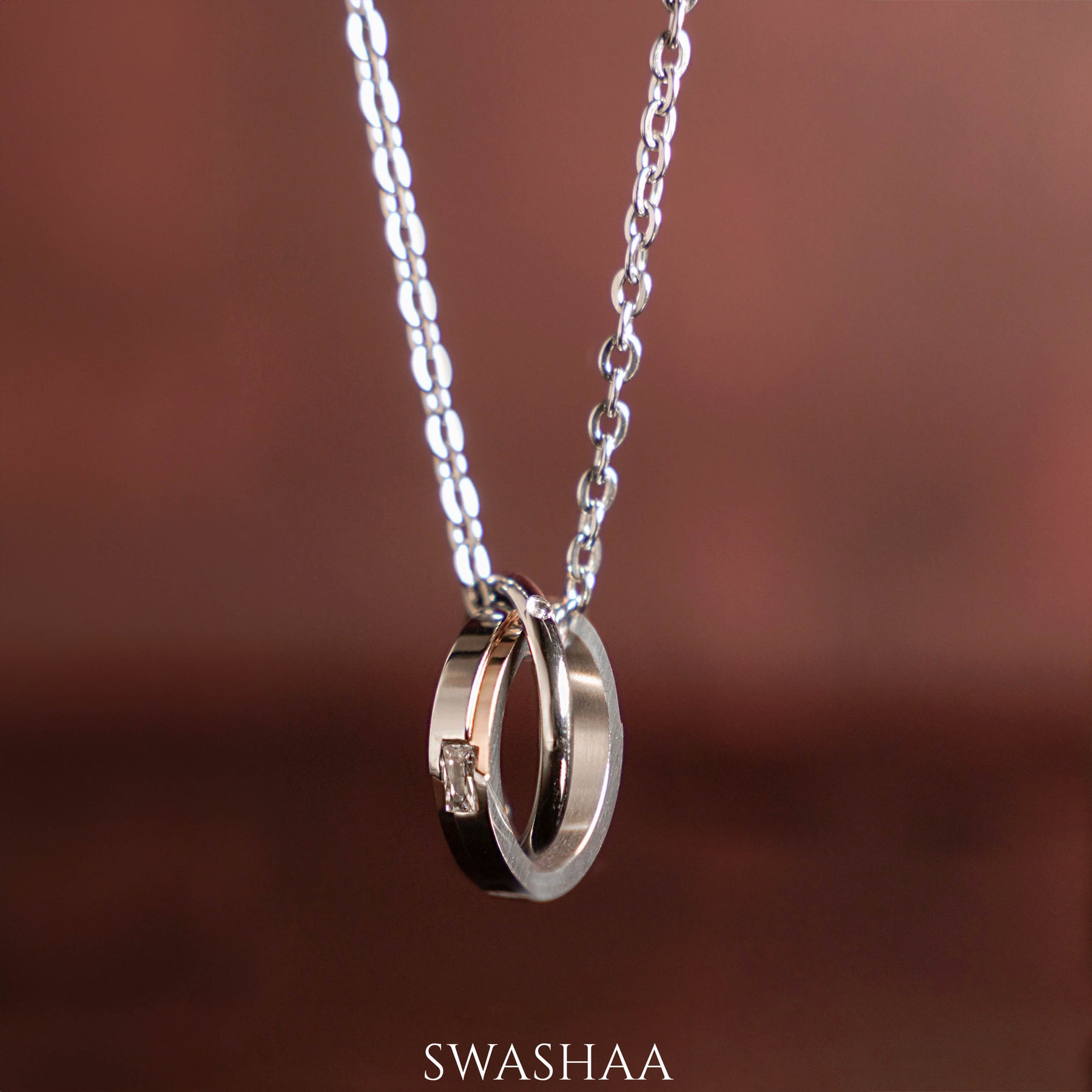 Elegance, sophistication, and timeless charm converge in this dual-tone pendant necklace, designed to symbolize harmony and unity. Featuring polished silver and subtle rose gold rings suspended from a durable silver chain, this statement piece effortlessly blends contemporary design with minimalist appeal. Perfect for daily wear or as a meaningful gift, it’s the ideal accessory for those who value both style and substance.