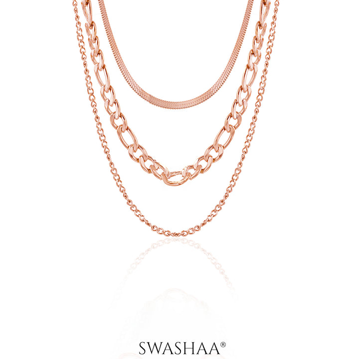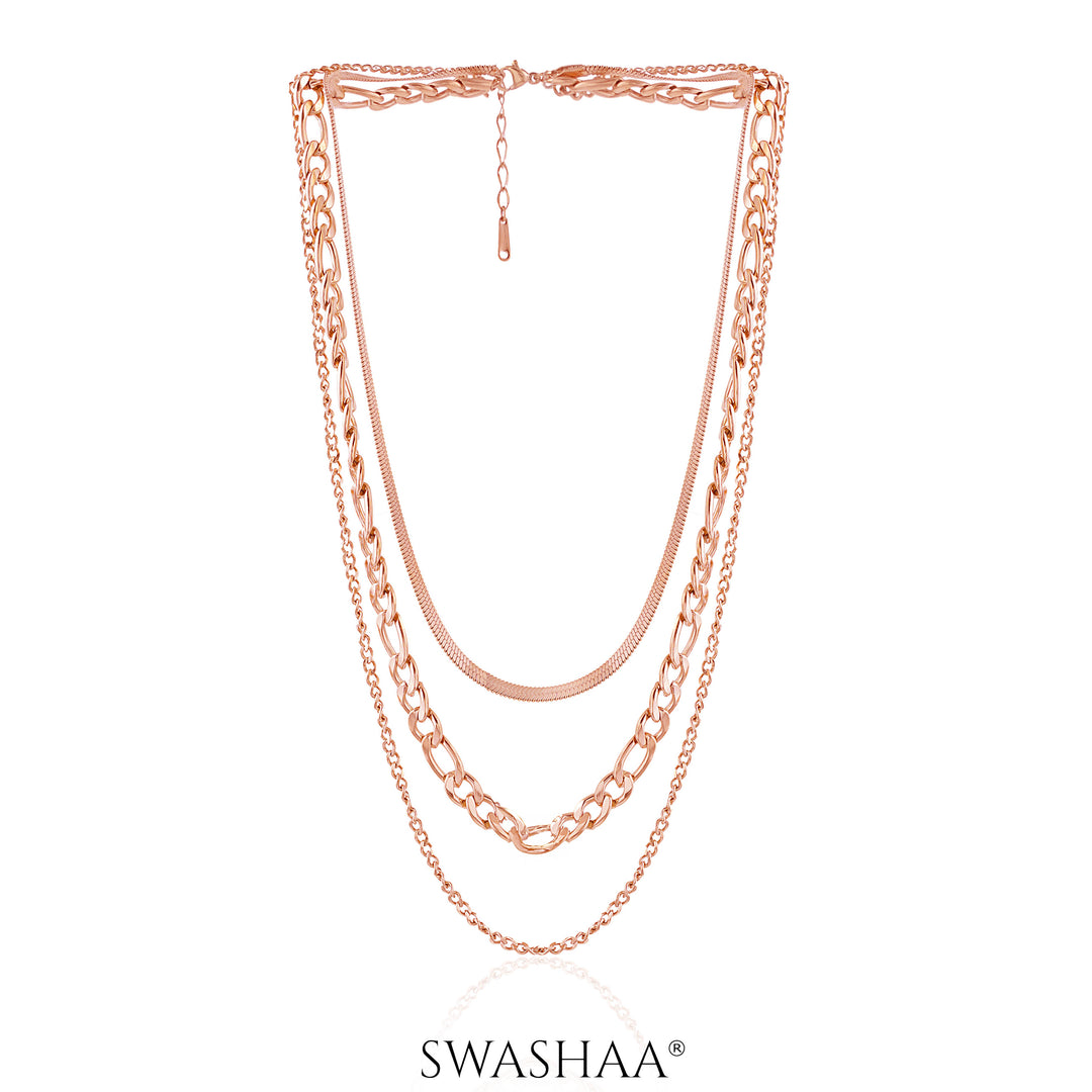 Make a statement with Swashaa's Lennon Men's Chain featuring three layers of snake chain, link chain, and minimal chain in a stunning rose gold finish. Perfect for special occasions or adding a touch of glamour to your everyday look.