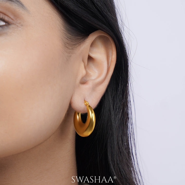 These gold-tone crescent hoop earrings exude a chic, minimalist vibe. Their bold, curved shape offers a modern twist on classic hoops, creating a voluminous look while maintaining a sleek and polished finish. The glossy surface catches the light effortlessly, adding a subtle sheen to any outfit. These versatile earrings are perfect for elevating casual daywear or complementing evening attire, making them a must-have for those who appreciate timeless elegance with a contemporary edge.