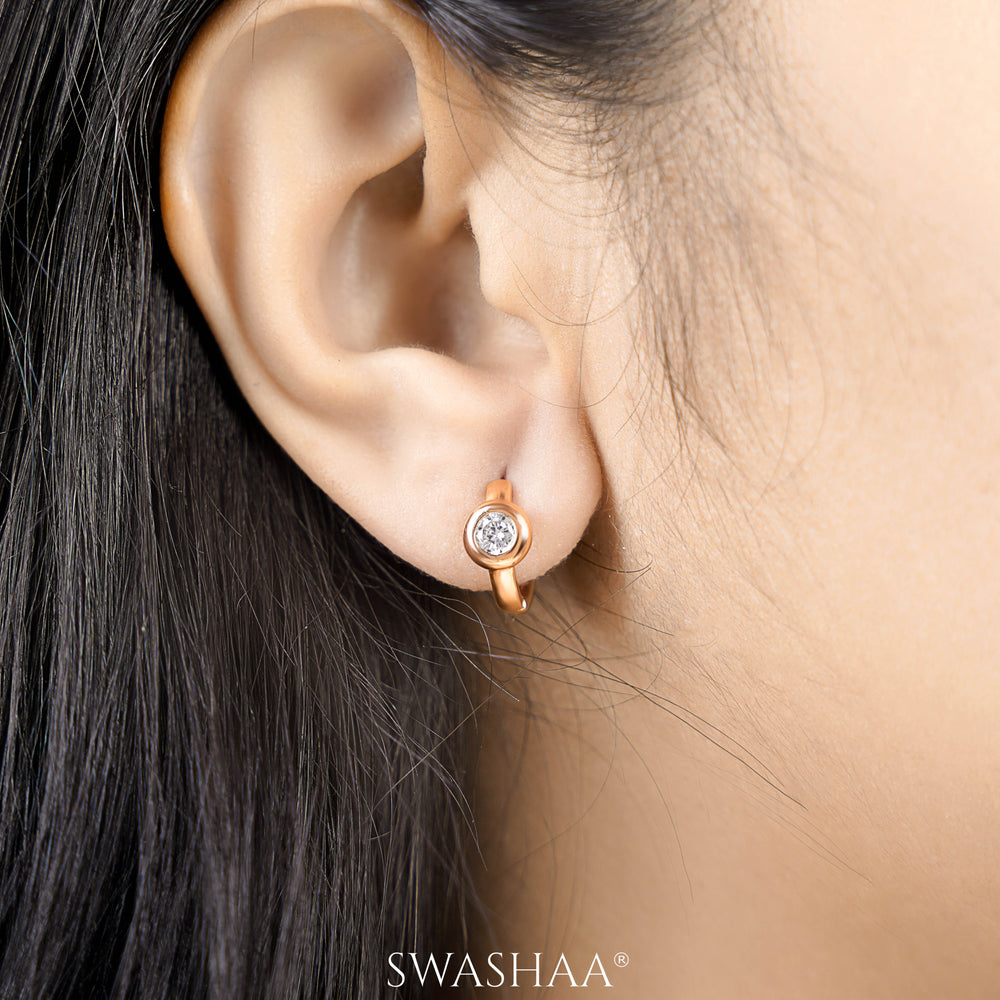 These elegant hoop earrings feature a minimalist design centered around a single sparkling solitaire crystal. The hoop gently cradles the crystal in a bezel setting, allowing it to catch the light from all angles. Perfect for both everyday wear and special occasions, these earrings offer a sophisticated yet understated charm, making them a versatile addition to any jewelry collection. Their compact size ensures comfort while adding a touch of elegance to your ensemble.