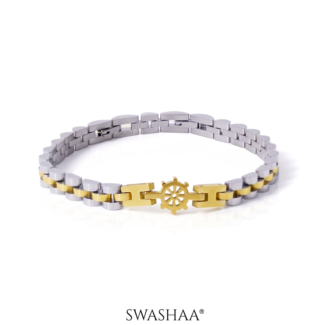 This sleek two-tone bracelet features a silver-tone interlinked chain accented with golden compass-like links, making it a perfect accessory for formal or casual wear. With its sturdy design and elegant detailing, this bracelet adds a unique touch to any outfit.