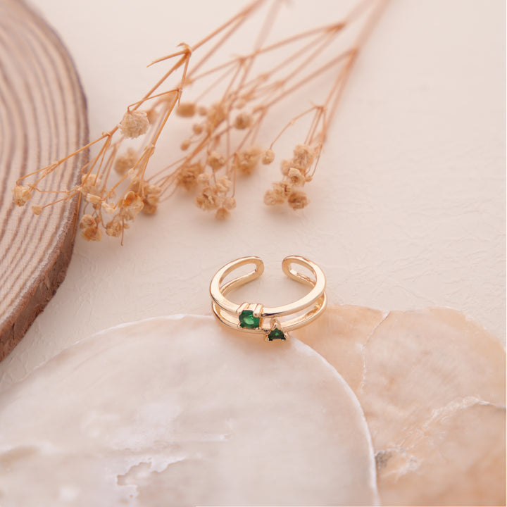 This contemporary open-band ring is crafted in a sleek gold-tone, featuring two striking green gemstones in different shapes—round and triangular—giving it a modern asymmetrical look. The unique, adjustable design offers both comfort and style, making it an ideal piece for everyday wear or layering with other rings. With its vibrant green hues, this ring adds a fresh, youthful touch to any ensemble. Perfect for casual outings or elegant evenings, this ring is a versatile accessory for any jewelry collection.