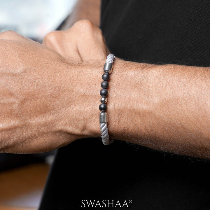 A sleek men's bracelet combines a silver-tone twisted rope with matte black beads and a polished metal bayonet clasp. A harmonious blend of modern style and rugged charm, it's perfect for casual or formal wear, making it a versatile addition to any accessory collection.