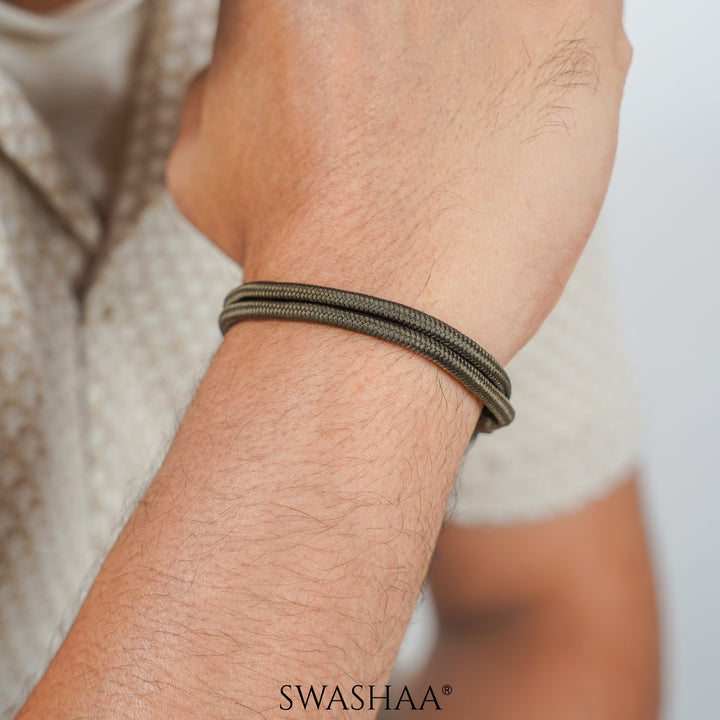 This men's rope bracelet features a rugged yet refined design with a military-inspired olive green rope, offering a durable and versatile accessory. The double-layered rope adds a bold texture, while the adjustable metal shackle clasp, with its polished finish, ensures a secure fit and easy wear. The natural tones and minimalist design make this bracelet perfect for everyday wear, whether you're dressing up for a casual outing or adding a touch of masculinity to a more sophisticated look. Ideal for those who appreciate both style and functionality.