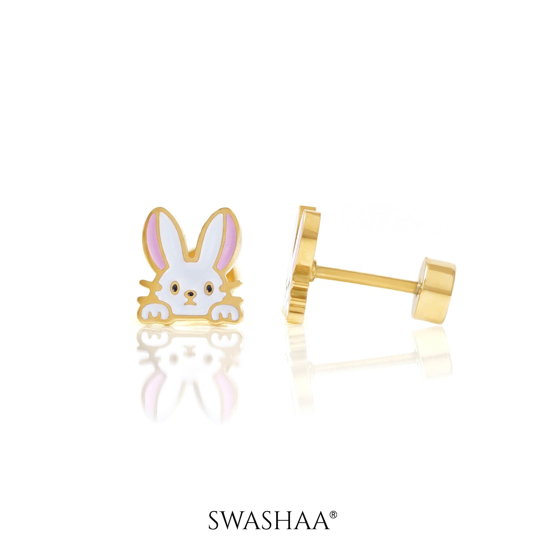 These adorable kid's earrings feature a playful rabbit face design, perfect for adding a touch of whimsy to your child’s look. The lightweight and comfortable fit makes them ideal for everyday wear. With cute pink ears and a charming expression, these earrings will surely become a favorite for playful outings or special occasions. A delightful accessory for any little one!