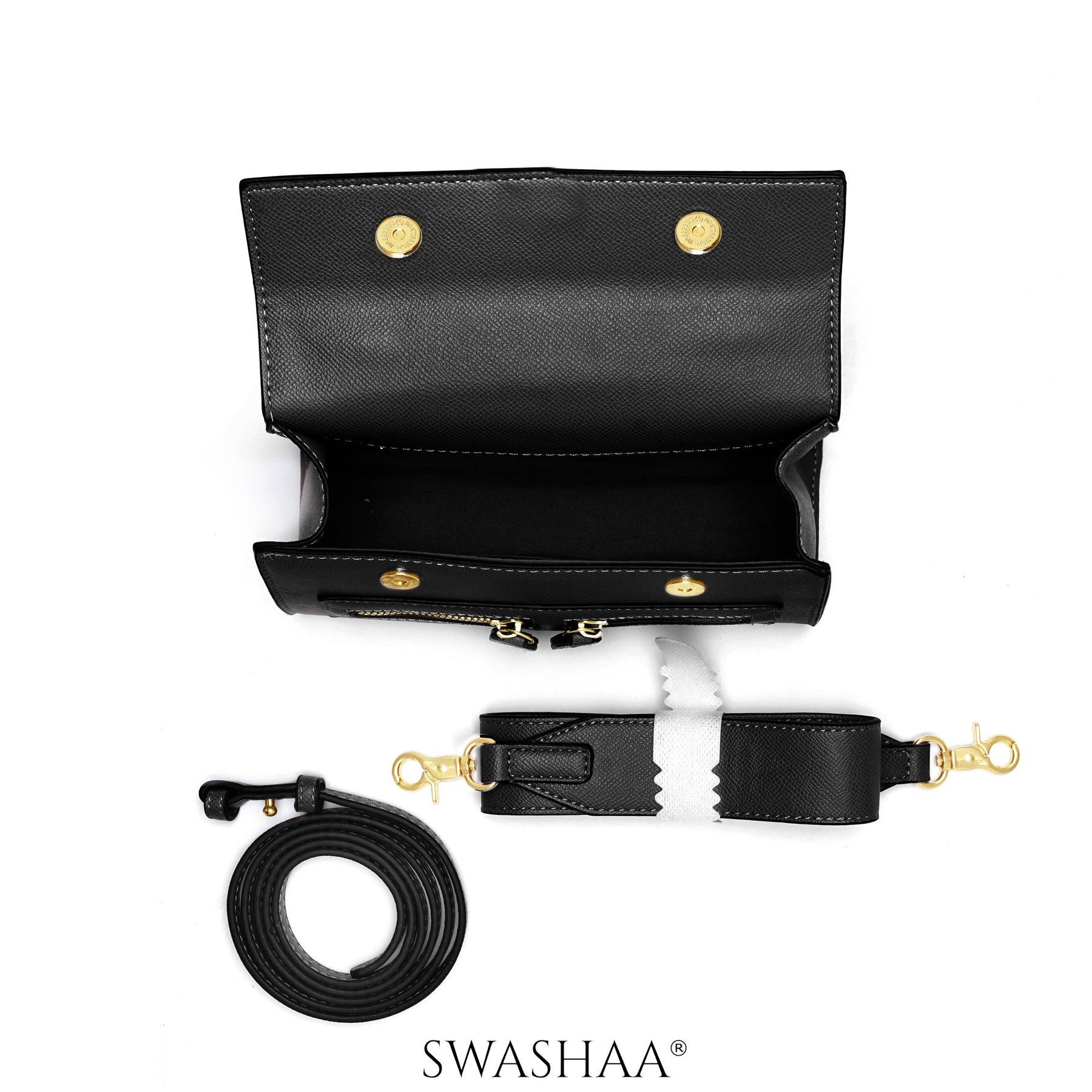 This Bag exudes elegance and sophistication. Crafted from premium black leather, it features a structured silhouette with refined gold-tone hardware accents. The front panel has dual zippered pockets design, adding both style and practicality. The compact top handle design provides a chic, modern look, while the adjustable strap offers versatility for hands-free wear. The sleek design and luxurious detailing make it a perfect companion for both formal occasions and everyday outings.