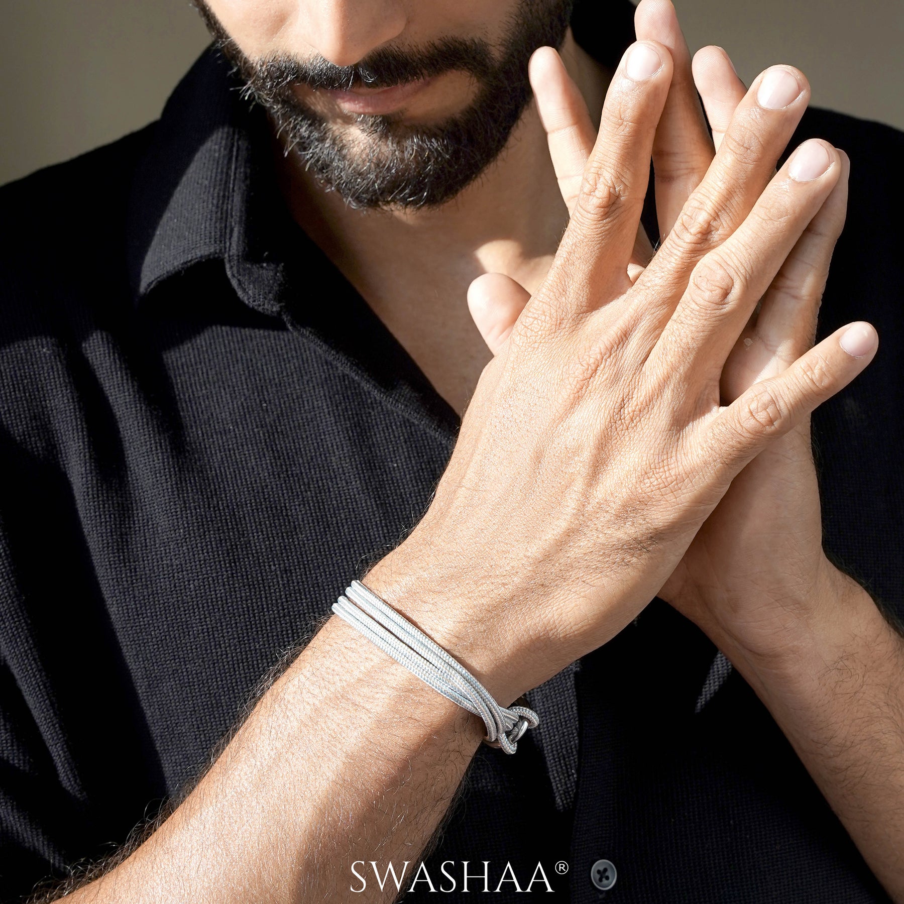 A sleek multi-wrap men's bracelet features a metallic silver-tone cord paired with a durable stainless steel shackle clasp, creating a modern and edgy look. The versatile design makes it perfect for layering or wearing solo, offering a stylish accessory for both casual and semi-formal outfits. Designed for those who love minimal yet bold statements.