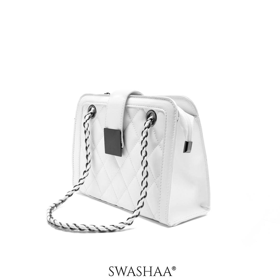 The bag features a rectangular shape with a structured design and classic, timeless Daisy White color. It has a smooth, quilted Pattern finish, adding a luxurious touch. This stylish accessory is designed to complement any outfit with its elegant design and practical features.