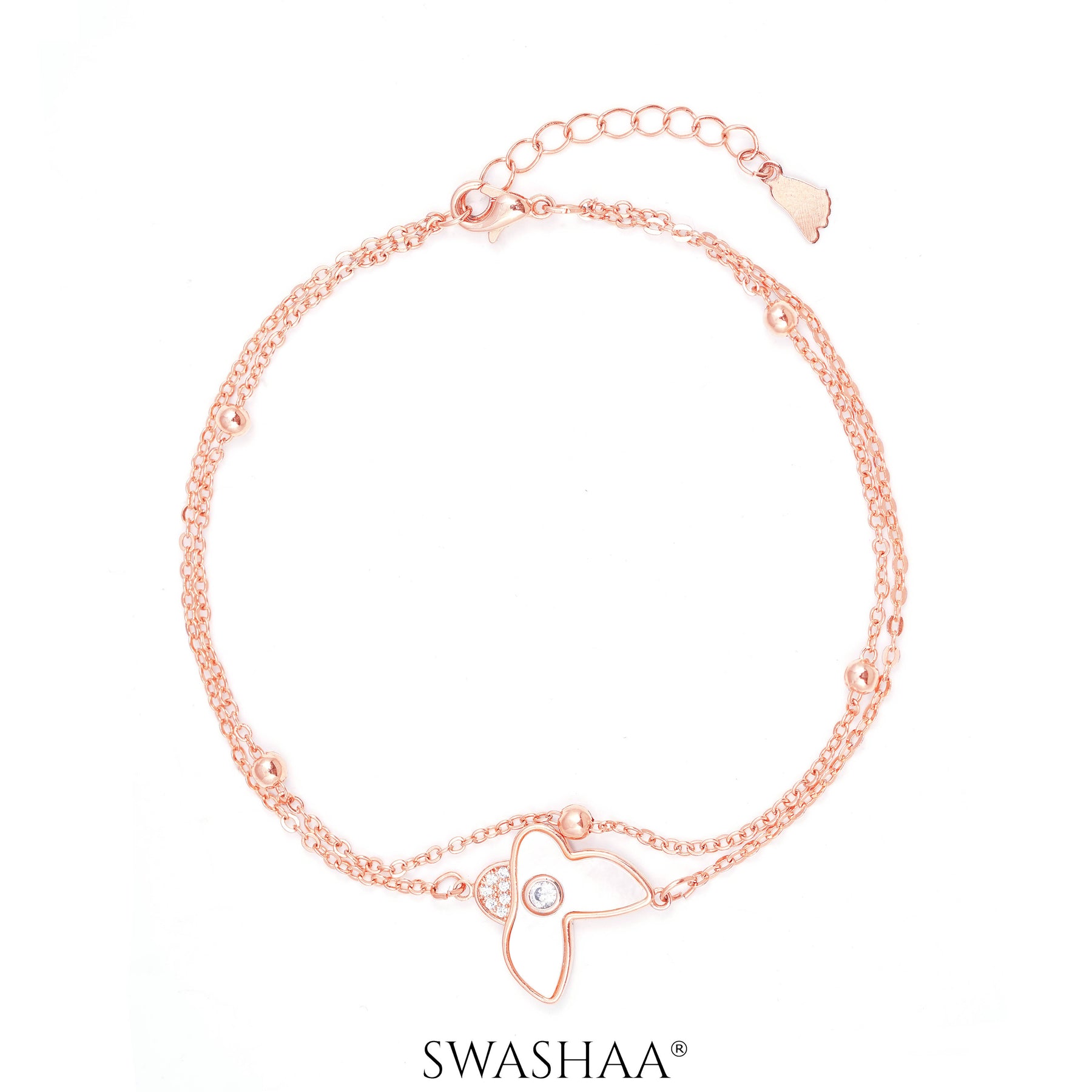 A delicate anklet featuring a rose gold-tone butterfly charm embellished with sparkling crystals, paired with dual-layered chains adorned with subtle bead accents. The adjustable closure ensures a comfortable fit, making it an ideal accessory for casual outings or beachside looks. A perfect piece to infuse a touch of whimsy and elegance into any ensemble.