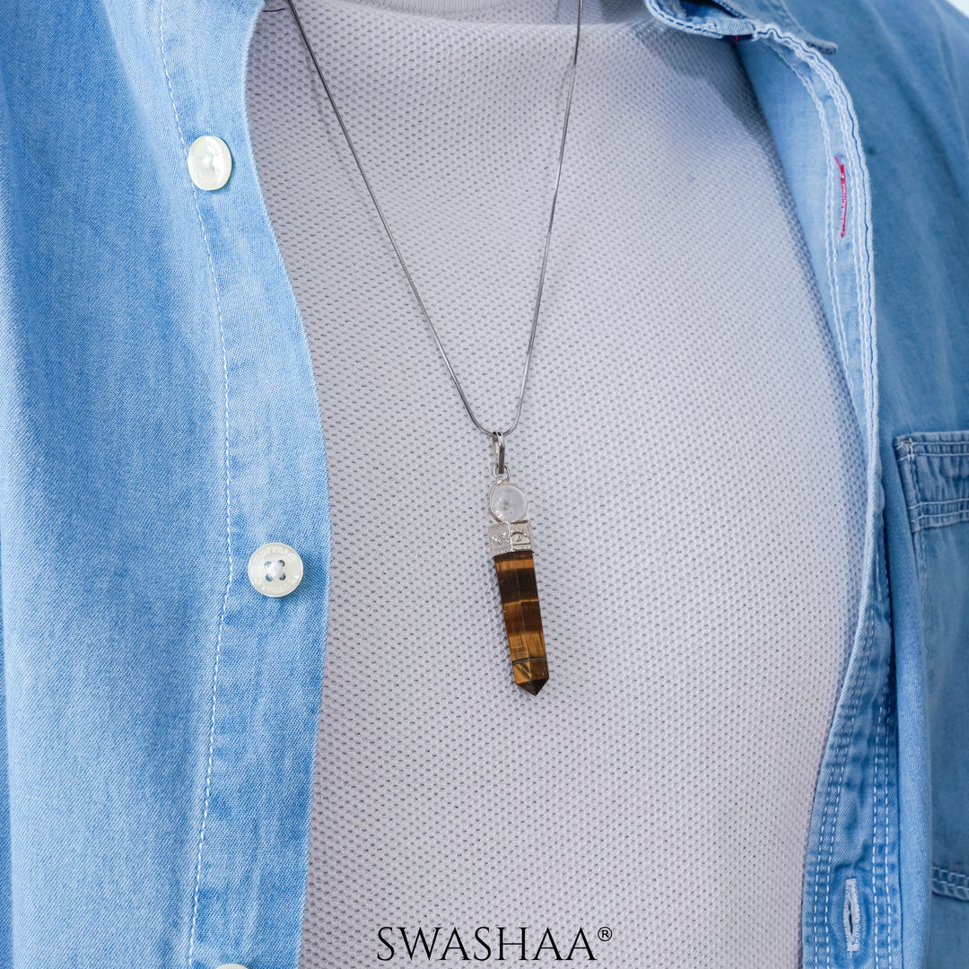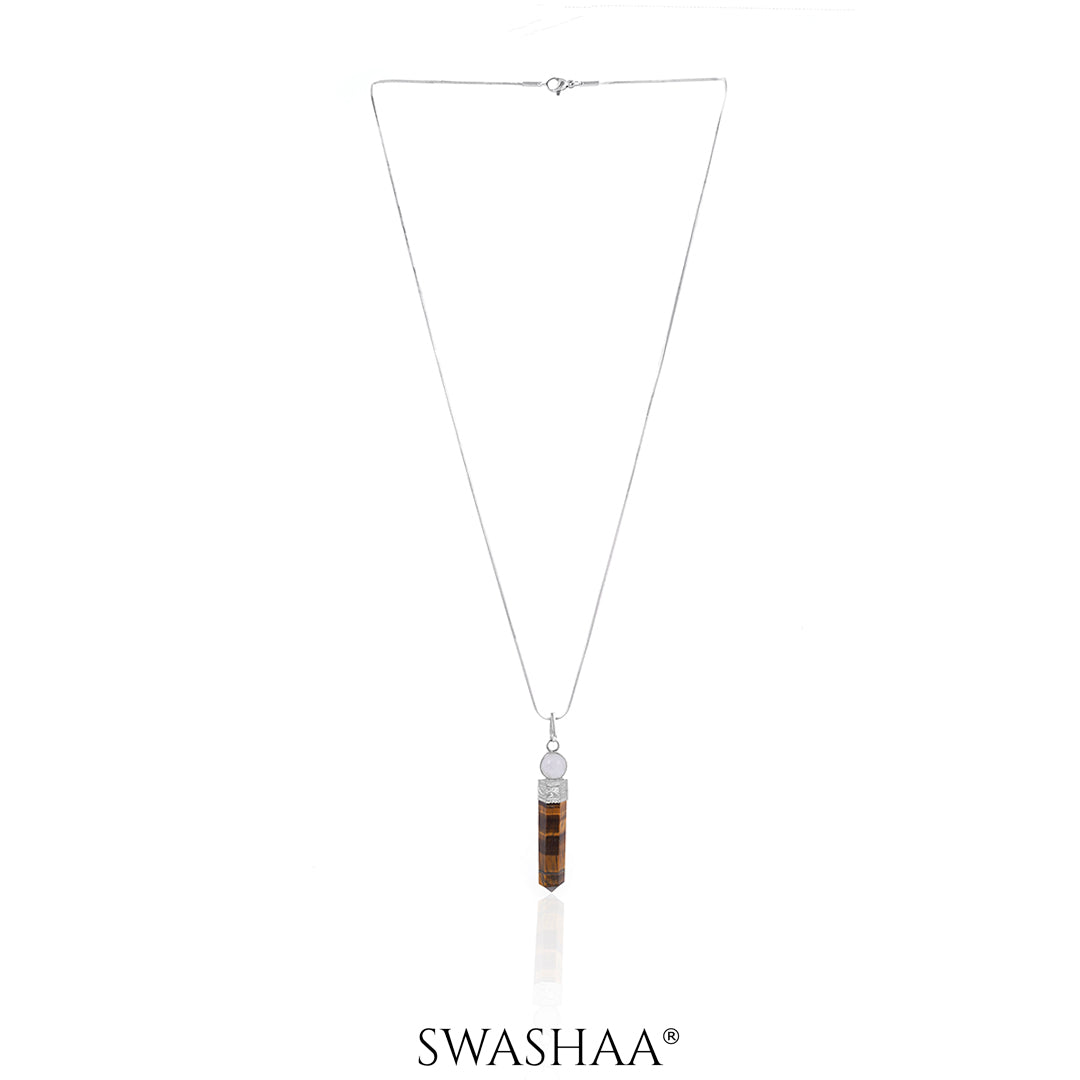 The Zenith Tiger's Gaze Pendant features a captivating duo of Tiger Eye stones, each exuding its own unique blend of golden hues and striking patterns. This pendant captures the mesmerizing gaze of the tiger, symbolizing courage, strength, and focus.